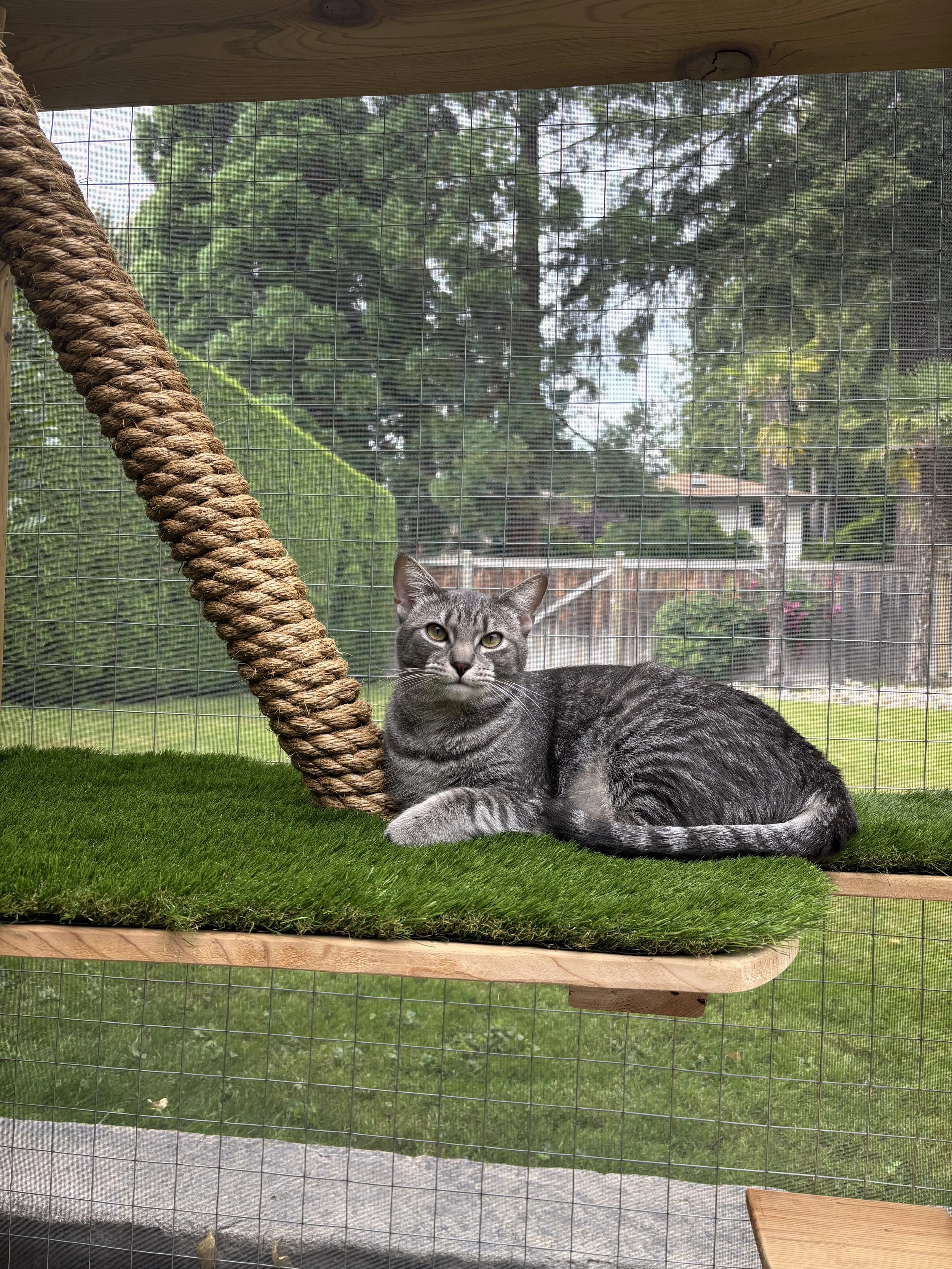 An outdoor cat enclosure, or “cat patio” is intended to keep your cat safe, allow access to the sights and smells of the outdoors, and provide a stimulating environment for both play and relaxation.
